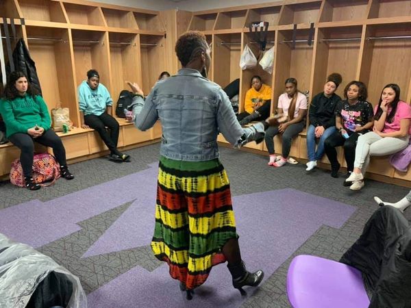 KYW founder Michelle Henderson empowering the Lady Middies Varsity Basketball Team.